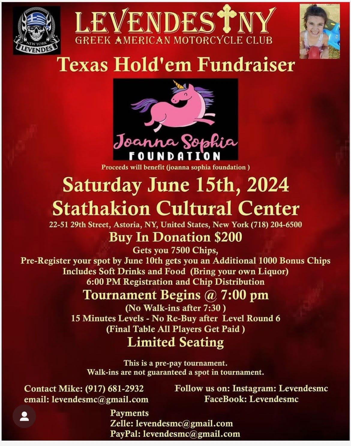 LEVENDESINY GREEK AMERICAN MOTORCYCLE CLUB Texas Hold’em Fundraiser Joanna Sophia FOUNDATION Proceeds will benefit (Joanna Sophia Foundation) Saturday June 15th, 2024